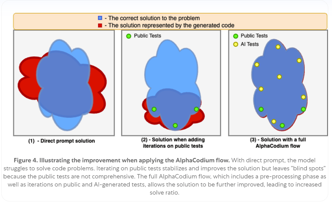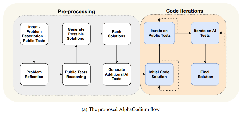 What does this mean exactly? Here’s from the authors themselves: “The proposed flow, is divided into two main phases: a pre-processing phase where we reason about the problem in natural language, and an iterative code generation phase where we generate, run, and fix a code solution against public and AI-generated tests.”
