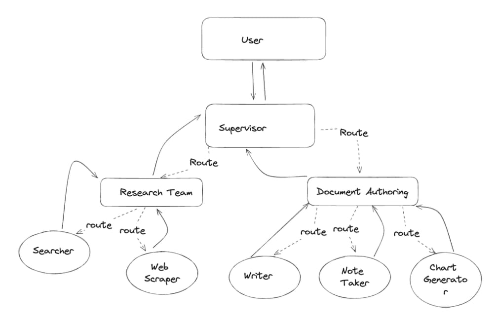 Langchain allows for hierarchical teams connected by a Supervisor, whereby subagents work as a team with routing being handled at multiple levels by the LLM i.e. Langgraph calling another Langgraph. This allows for orchestrating more complex processes with each sub-agent allowing for a custom prompt, LLM, tools and code.